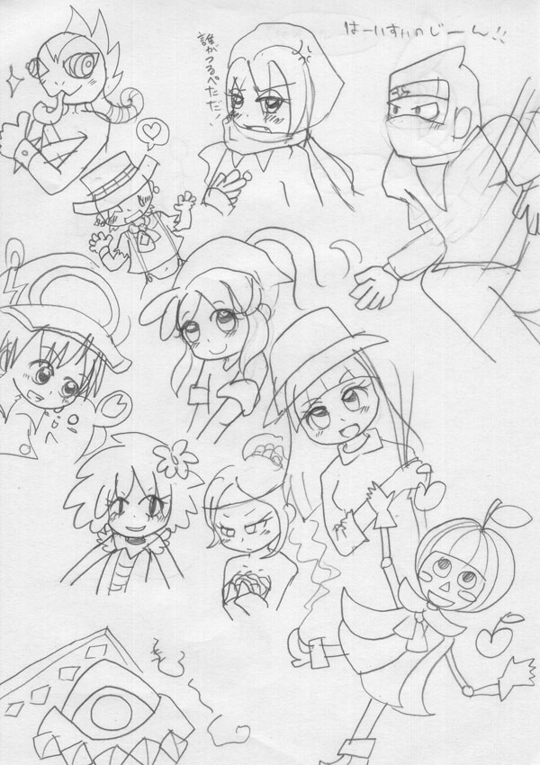 17キャラを一通り描いてみましたシリーズその2。 義男、町子、ゲレゲレ、ペロ、貝&ゼロ、らいむ、ベル、薔薇マリー、オディール、タタン、弁慶 タタンを擬人化してみたい今日この頃。弁慶もっと丁寧に描いてやれば良かったと 後悔。そして背水の陣のメロディが大幅に間違ってるという悲劇。